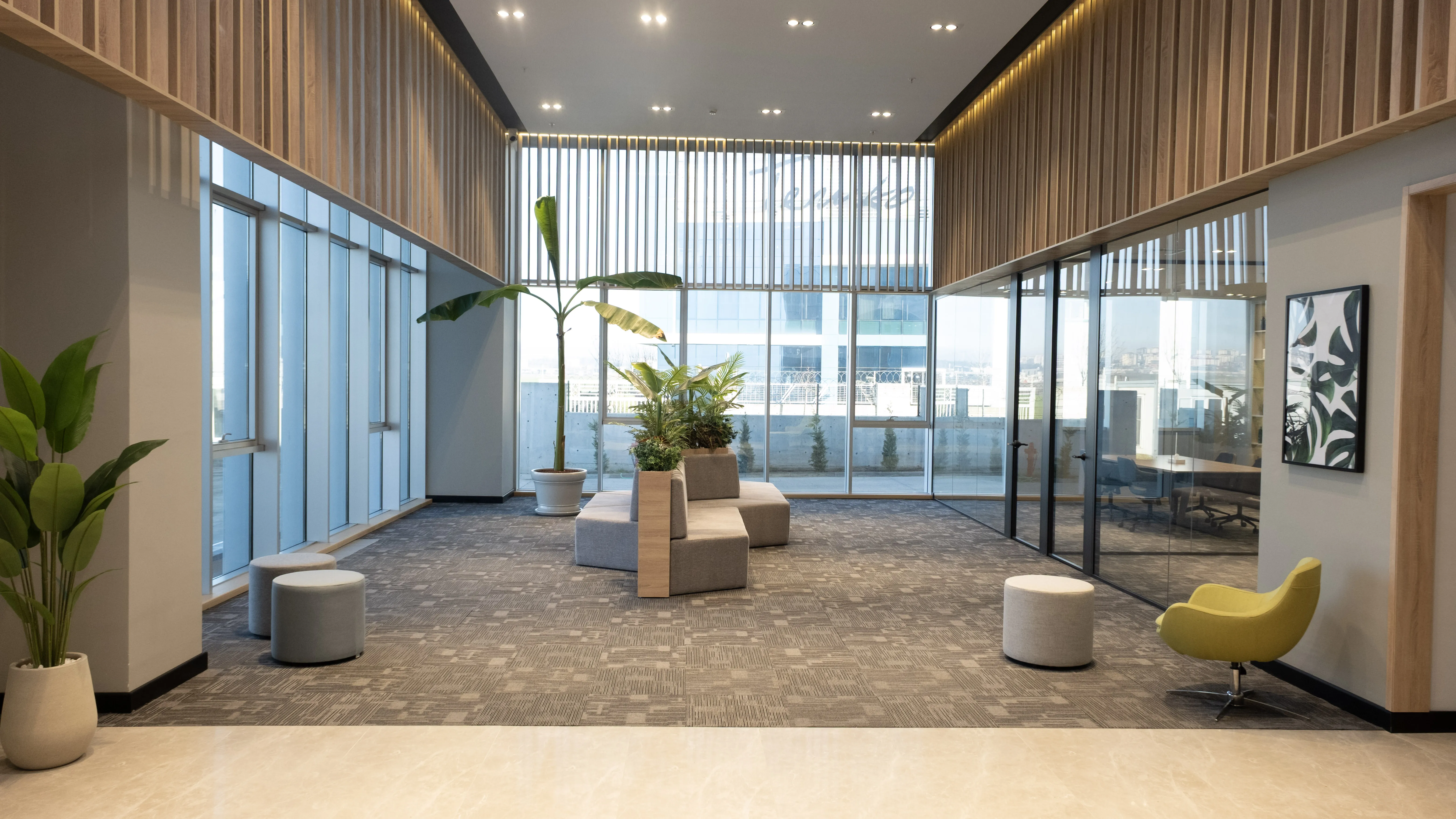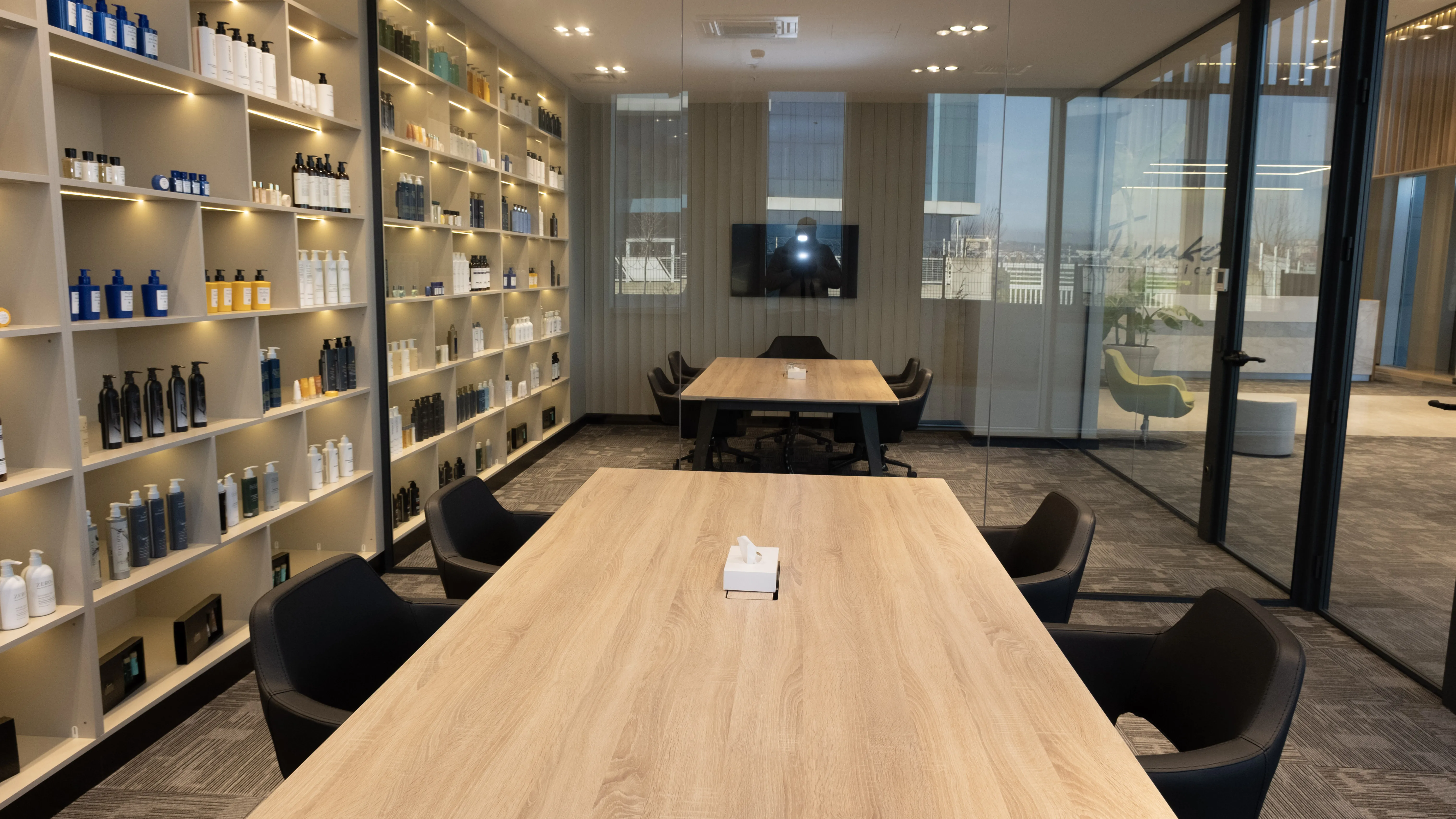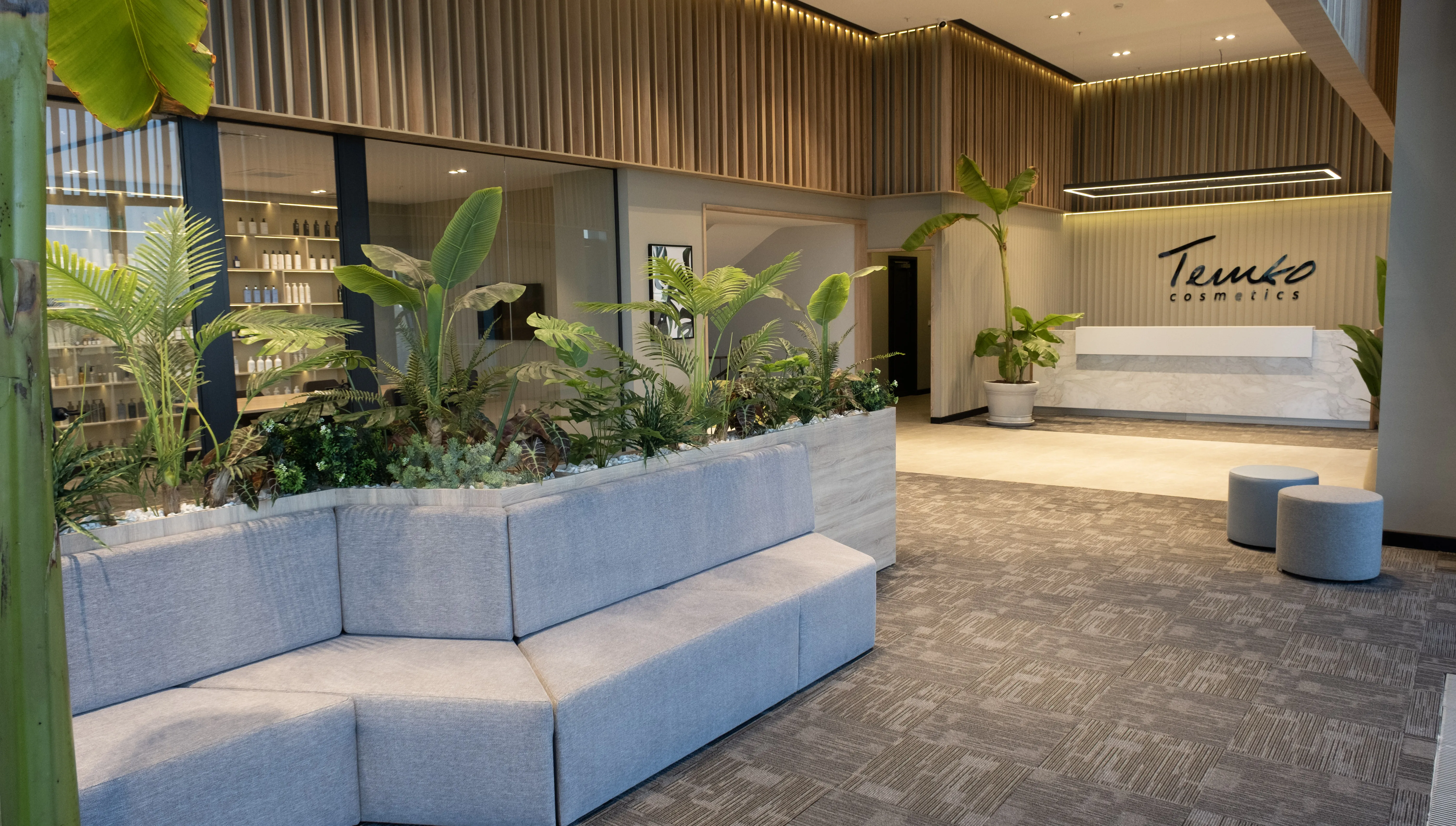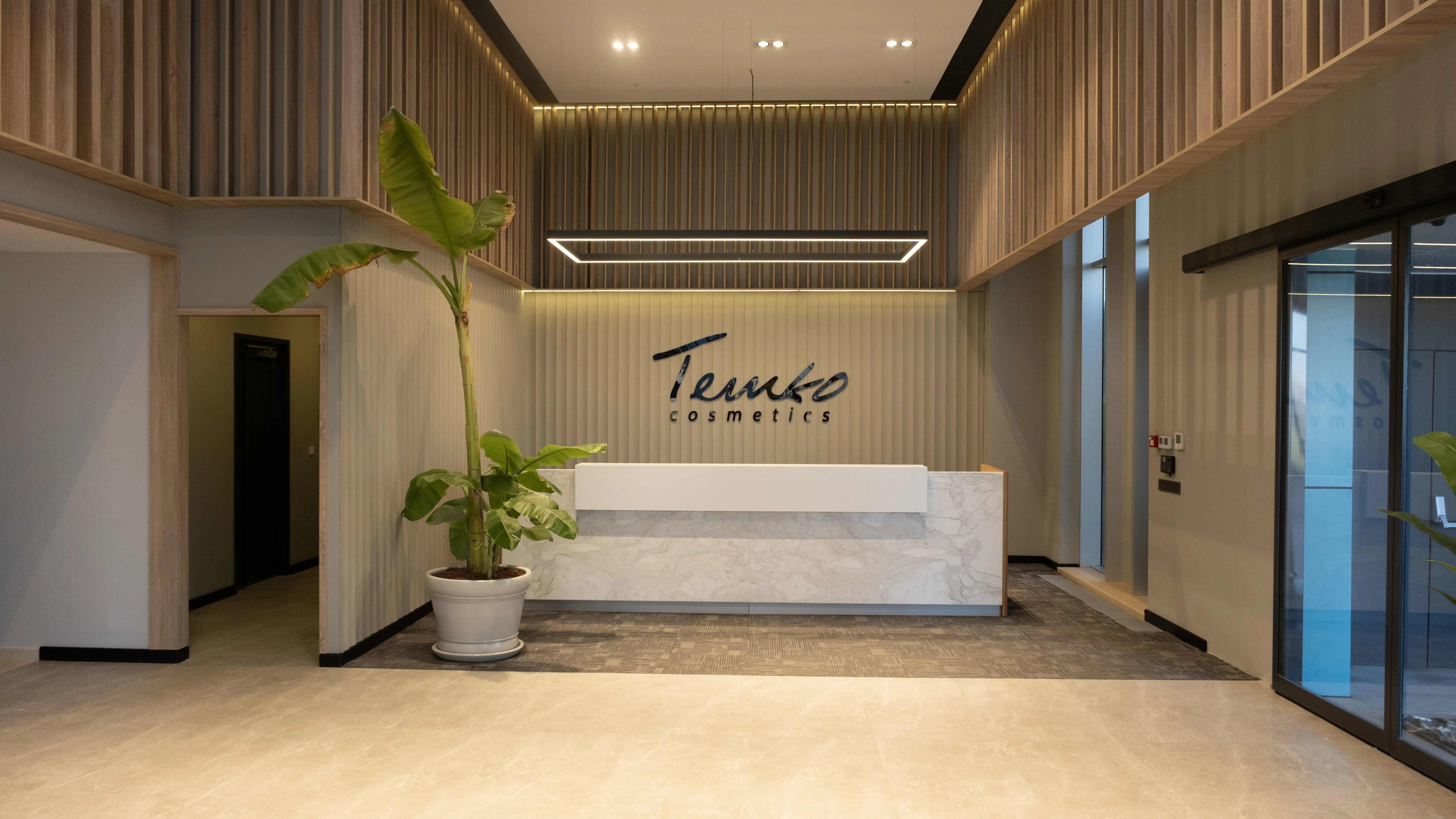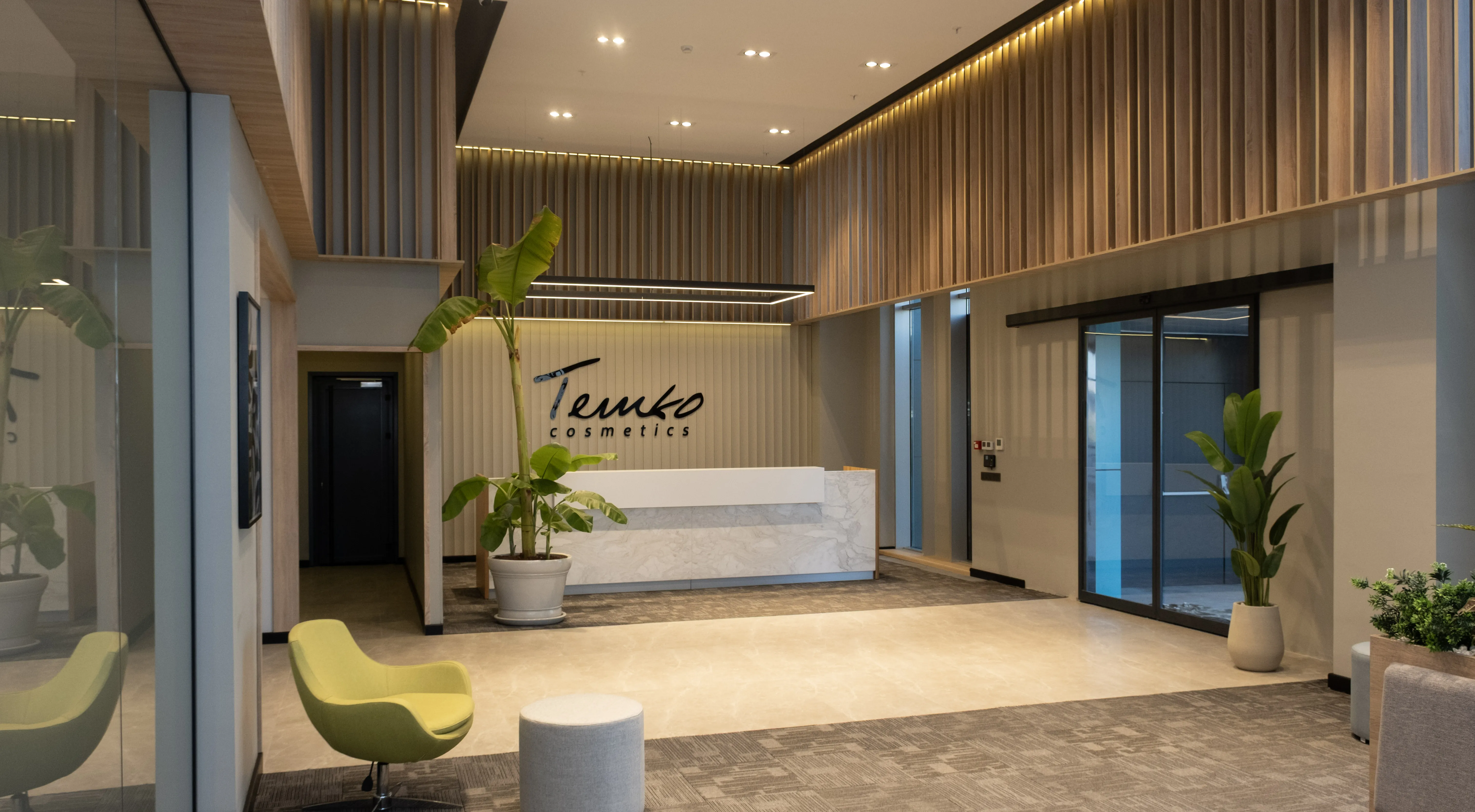 Temko Kozmetik için tasarlanan projede, kurumsal kimliği yansıtan modern ve işlevsel bir çalışma alanı oluşturuldu. Geniş camlar, ahşap paneller ve bitkilendirme ile ferah bir lobi, sade ve konforlu bir ofis düzeni kurgulandı.