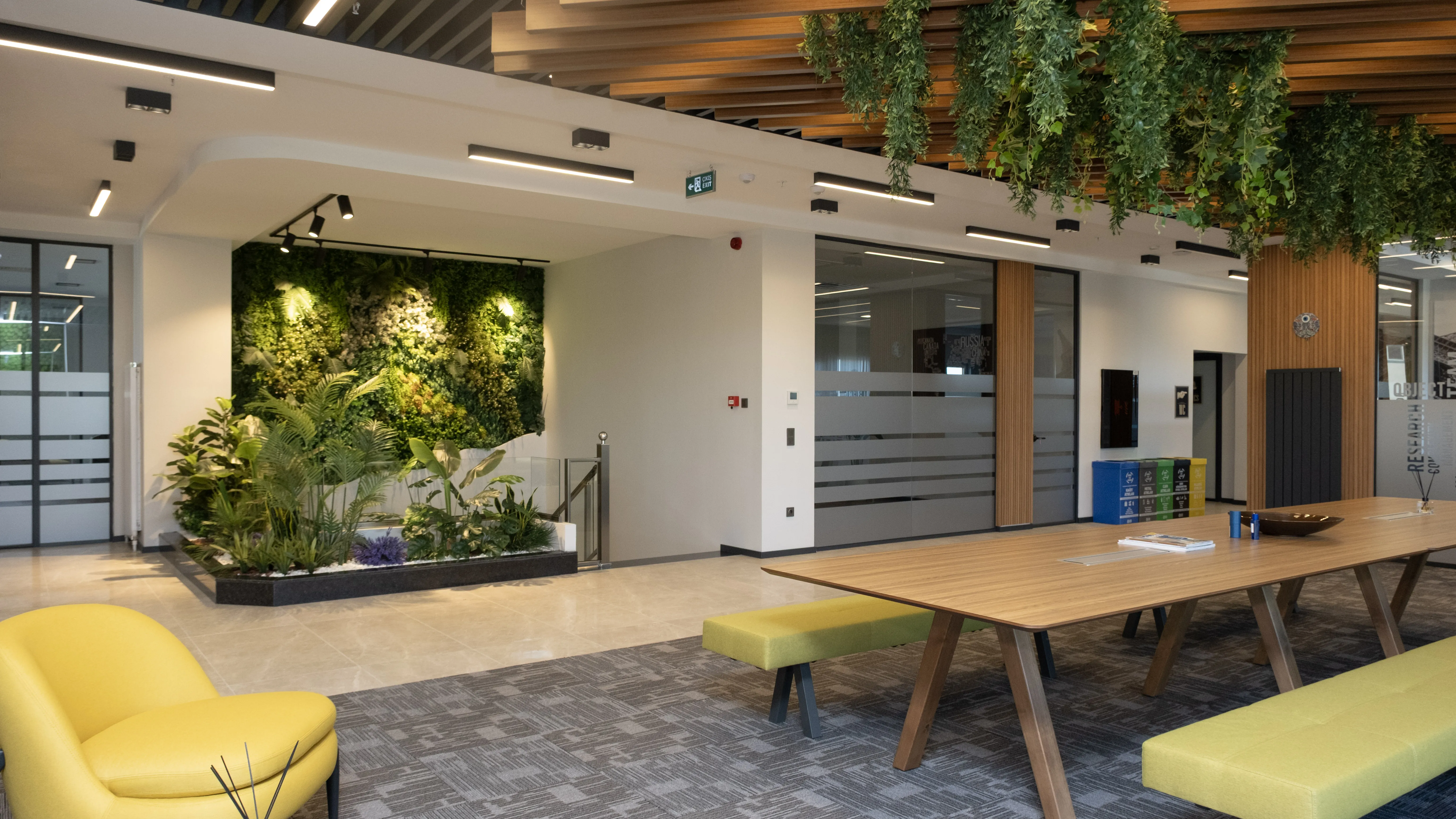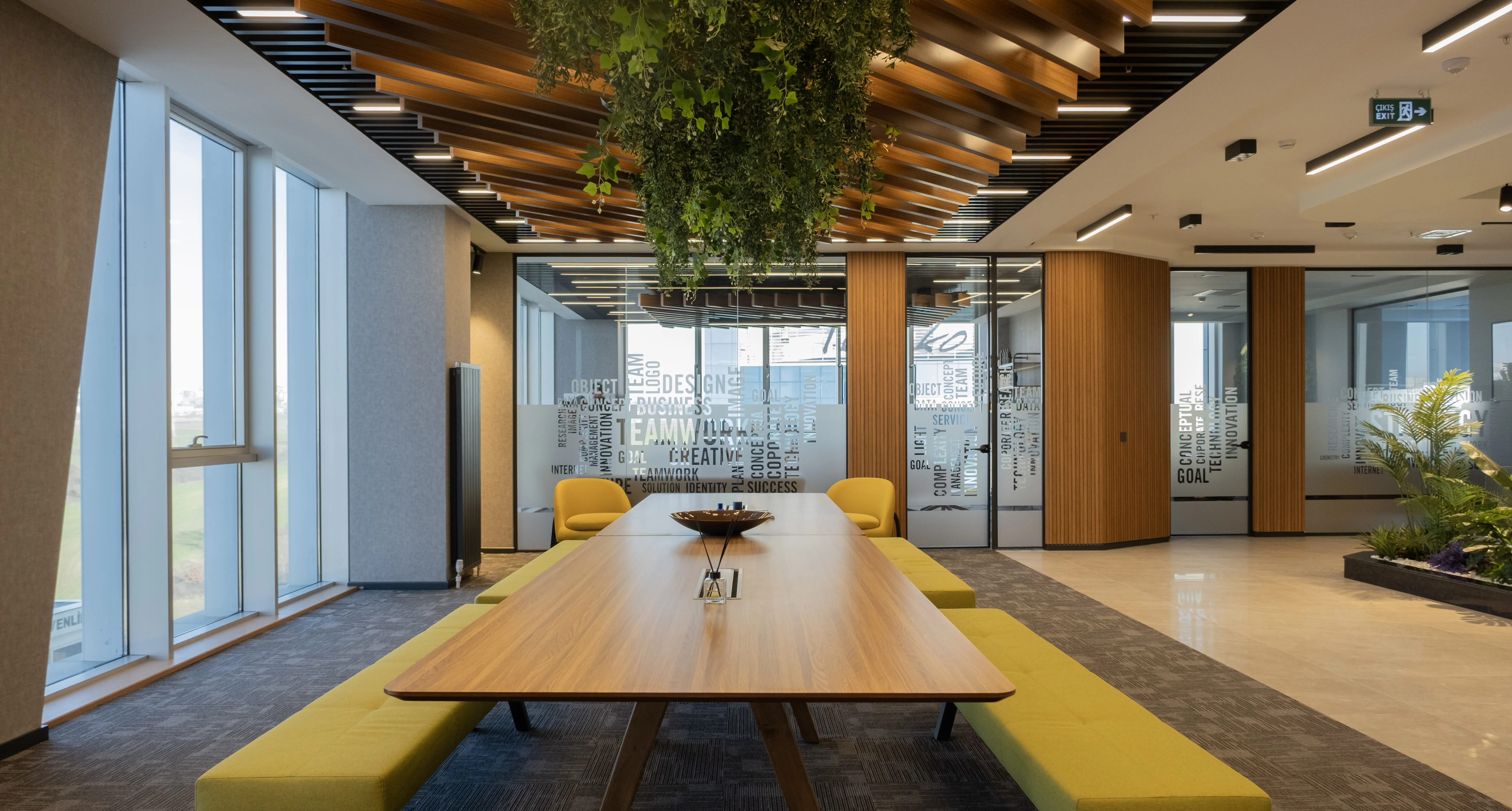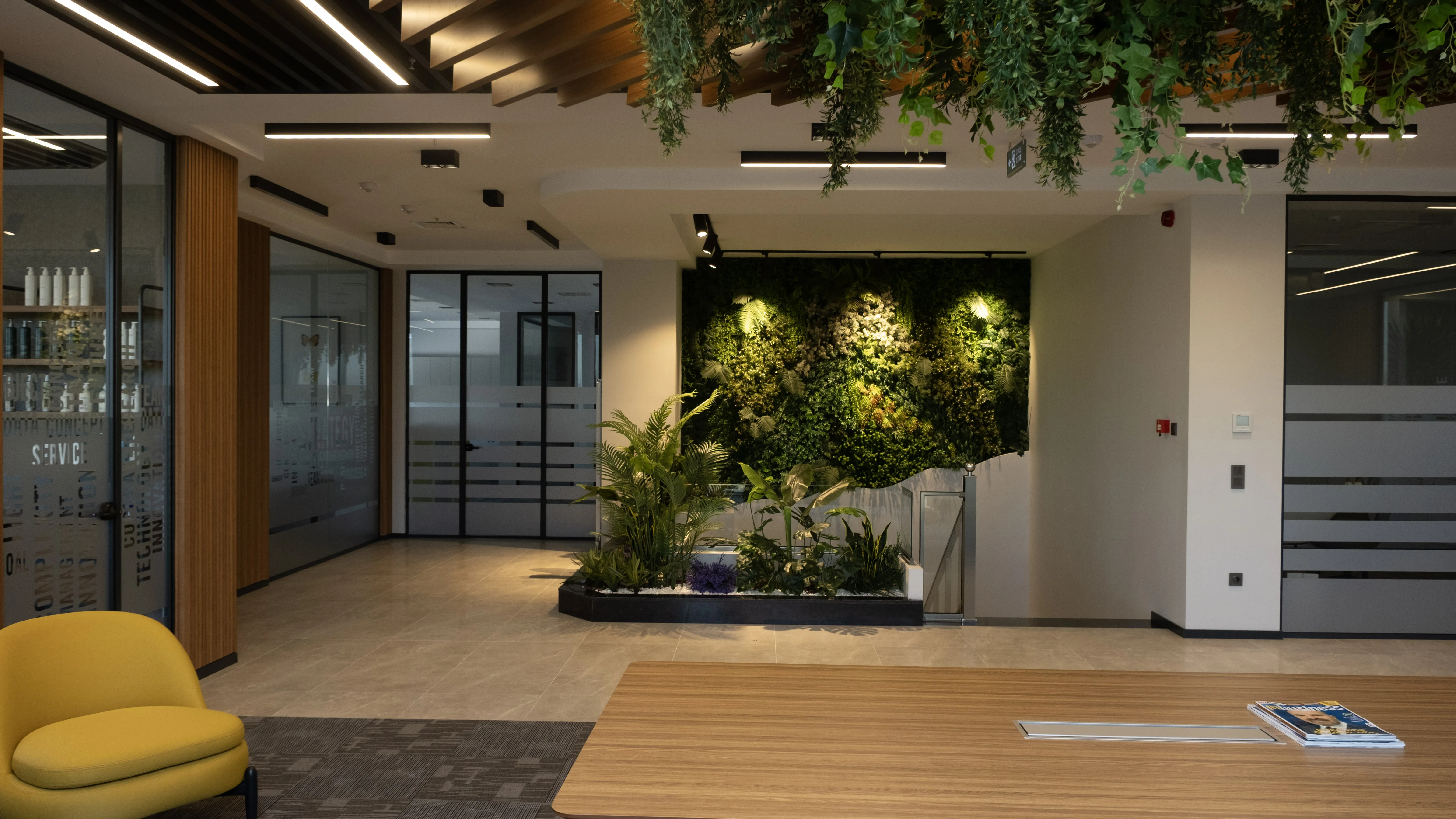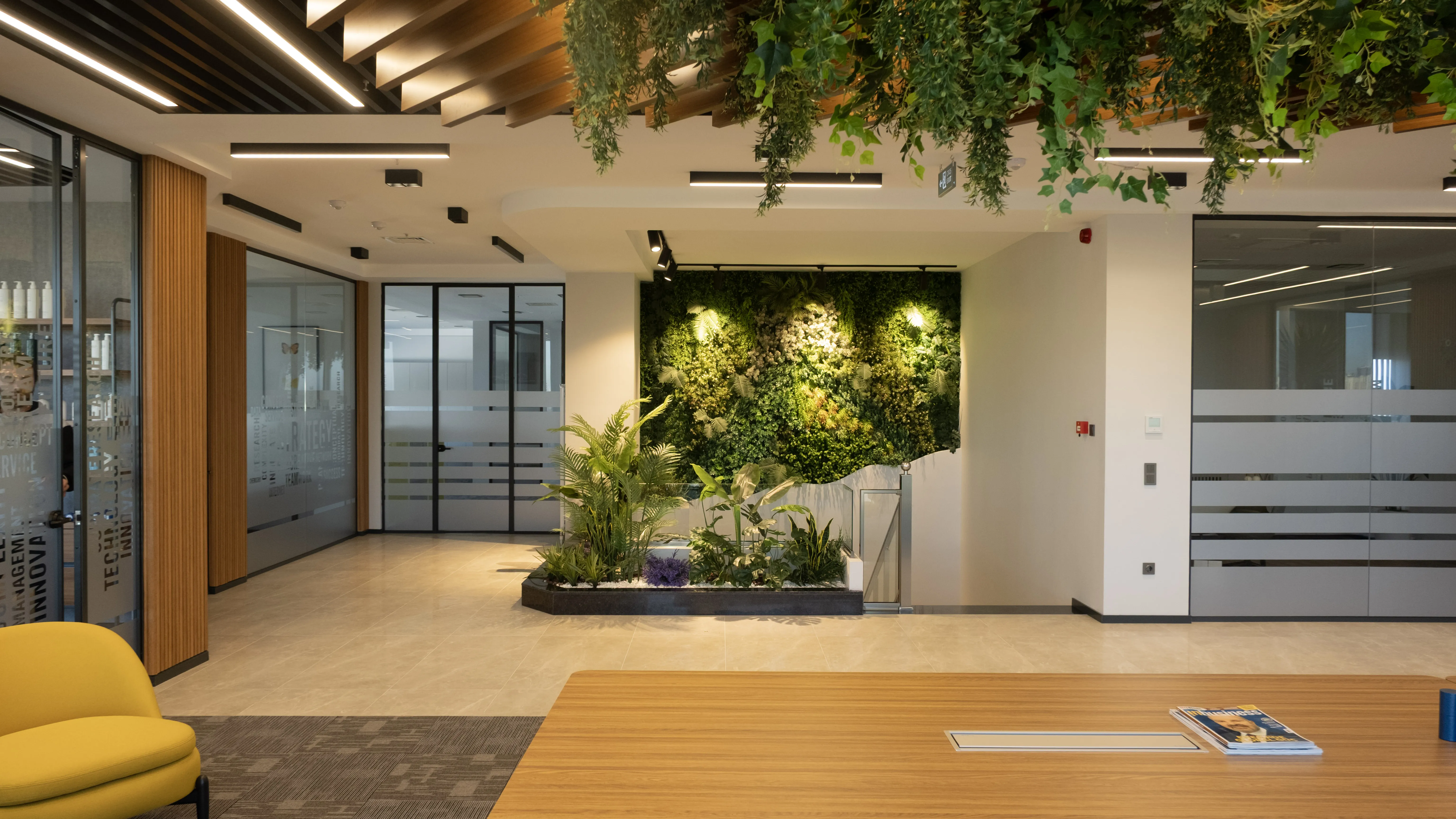 Temko Kozmetik için tasarlanan projede, kurumsal kimliği yansıtan modern ve işlevsel bir çalışma alanı oluşturuldu. Geniş camlar, ahşap paneller ve bitkilendirme ile ferah bir lobi, sade ve konforlu bir ofis düzeni kurgulandı.